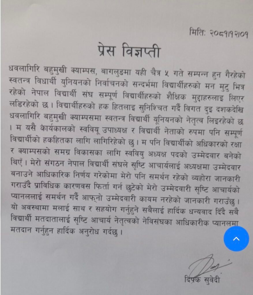 दिपक सुवेदीले स्वतन्त्र विद्यार्थी युनियन धवलागिरि बहुमुखी क्यामपस बागलुङको अध्यक्ष पदको उम्मेदवारी फिर्ता लिएका छन् । शुक्रबार बागलुङमा पत्रकार भेटघाट कार्यक्रम गरी सुवेदीले आफ्नो समर्थन नेपाल विद्यार्थी संघका आधिकारिक उम्मेदवार सृष्टि आचार्यको नेतृत्वको प्यानललाई रहेको घोषणा गरेका छन् । ‘मैले वारेस मार्फत उम्मेदवारी दर्ता गरेको थिएँ, वारेसबाटै फिर्ता हुन्छ होला भन्ने लागेर जिल्ला बाहिर काम परेकाले उता गएँ,’उनले भने,‘यहाँ मेरो पनि स्ववियु अध्यक्षमा उम्मेदवारी कायम रहेको भन्ने आएपछि मैले स्पष्ट गर्नका लागि यो पत्रकार भेटघाट गरिएको हो । यही कार्यक्रम मार्फत मेरो उम्मेदवार कायम नरहेको र सृष्टि आचार्यको नेविसंघको आधिकारिक प्यानललाई मतदान गरी विजयी गराउन सबैलाई अनुरोध गर्दछु ।’