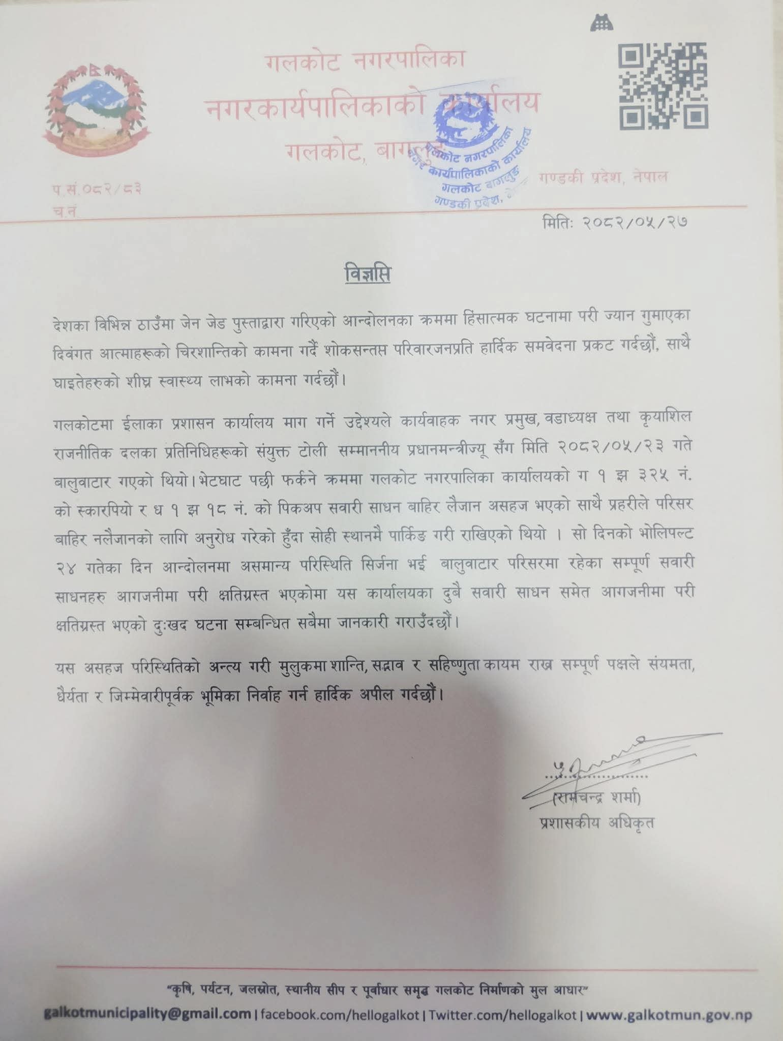 घटनापछि गलकोट नगरपालिकाले विज्ञप्ति जारी गर्दै देशभरका विभिन्न स्थानमा ज्यान गुमाएकाहरूको आत्माको चीरशान्तिको कामना गर्दै श्रद्धाञ्जलि अर्पण गरेको छ। साथै घाइतेहरूको शीघ्र स्वास्थ्यलाभको कामना गर्दै यस दुःखद घटनाप्रति गहिरो संवेदना व्यक्त गरेको छ।