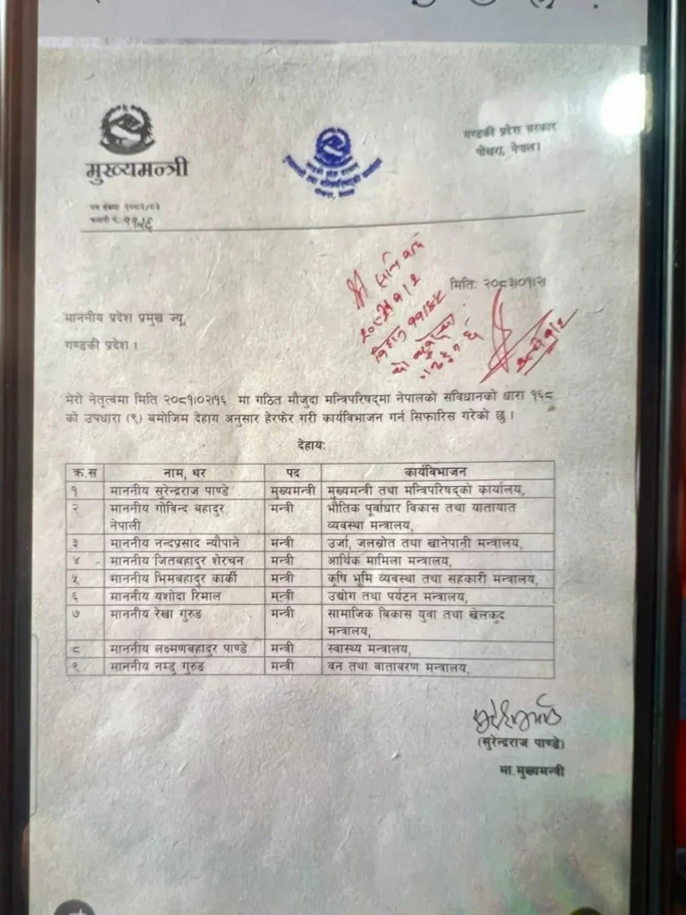 गण्डकी प्रदेशमा सबै मन्त्री फेरिएका छन् । मुख्यमन्त्री सुरेन्द्र पाण्डेको सिफारिसमा बुधबार प्रदेश प्रमुख डिल्लीराज भट्टले नवनियुक्त मन्त्रीहरुलाई पद तथा गोपनियताको शपथ गराएका छन्।